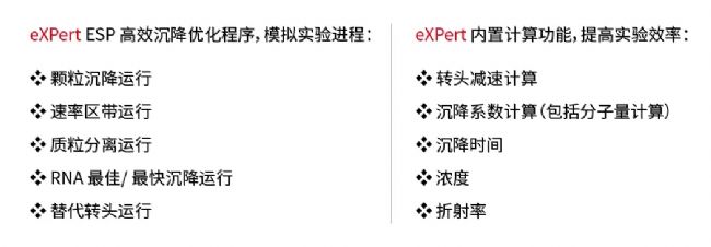 - 對(duì)于差速離心以及操作相對(duì)復(fù)雜的密度梯度離心方法,內(nèi)置的eXPert離心專家軟件可模擬不同實(shí)驗(yàn)進(jìn)程以及計(jì)算相應(yīng)實(shí)驗(yàn)參數(shù)計(jì)算,幫助用戶在病毒分離時(shí)設(shè)計(jì)實(shí)驗(yàn)與運(yùn)行,提高實(shí)驗(yàn)效率。