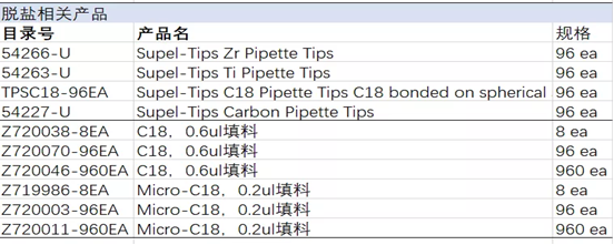 質(zhì)譜儀一般懼怕樣品中含鹽,所以對肽段脫鹽非常有必要,但樣本珍貴,需要保證高回收率且快速高效進(jìn)行分析物的吸附/洗脫,且后續(xù)能直接用與質(zhì)譜、HPLC、毛細(xì)電泳分析。如以下Supel-Tips和ZipTip系列。