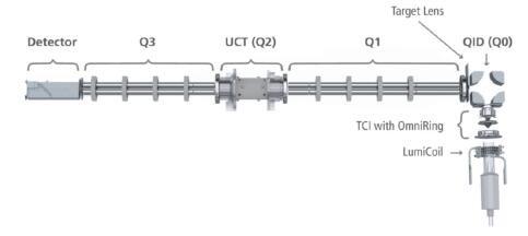 四極桿離子偏轉(zhuǎn)器(Q0)具有到動(dòng)態(tài)掃描和固定離子篩選模式,第一個(gè)質(zhì)量分析器(Q1)可用作質(zhì)量分析器或離子導(dǎo)桿,通用池四極桿(Q2)靈活選擇離子導(dǎo)桿(STD)、動(dòng)能歧視(KED)和動(dòng)態(tài)質(zhì)量帶寬調(diào)諧(DRC)模式,第二個(gè)質(zhì)量分析器(Q3)可用作質(zhì)量分析器或離子導(dǎo)桿。