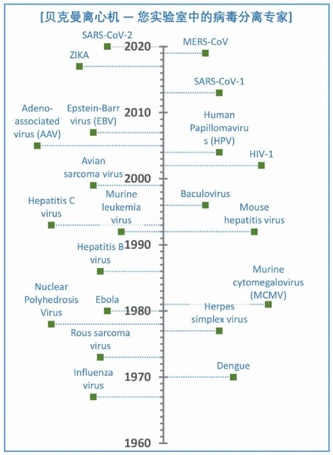 自1947年第一臺商用超速離心機(jī)發(fā)明以來,貝克曼庫爾特離心技術(shù)已有70多年的歷史。早在19世紀(jì)60年代,已有許多用戶使用貝克曼離心機(jī)成功分離了多種病毒顆粒。截至現(xiàn)在,貝克曼超離已幫助客戶分離純化得到流感病毒、肝炎病毒、腺病毒、慢病毒等多種幾乎覆蓋所有類型的病毒樣品。貝克曼龐大的用戶群體已為研究人員儲存發(fā)表了數(shù)以萬計(jì)的病毒分離方法與文獻(xiàn),助力病毒研究的同時,也使貝克曼離心機(jī)成為了當(dāng)之無愧的病毒分離專家。