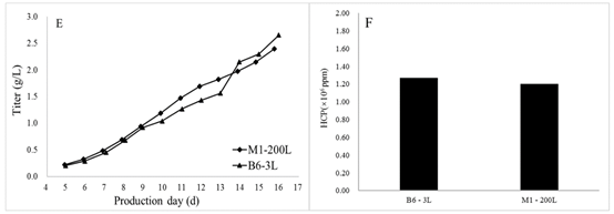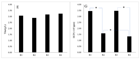 隨后在B4基礎(chǔ)上,進(jìn)行了補料體積優(yōu)化(B5)和金屬離子的添加(B6);在添加了金屬離子后,HCP得到了進(jìn)一步的降低。