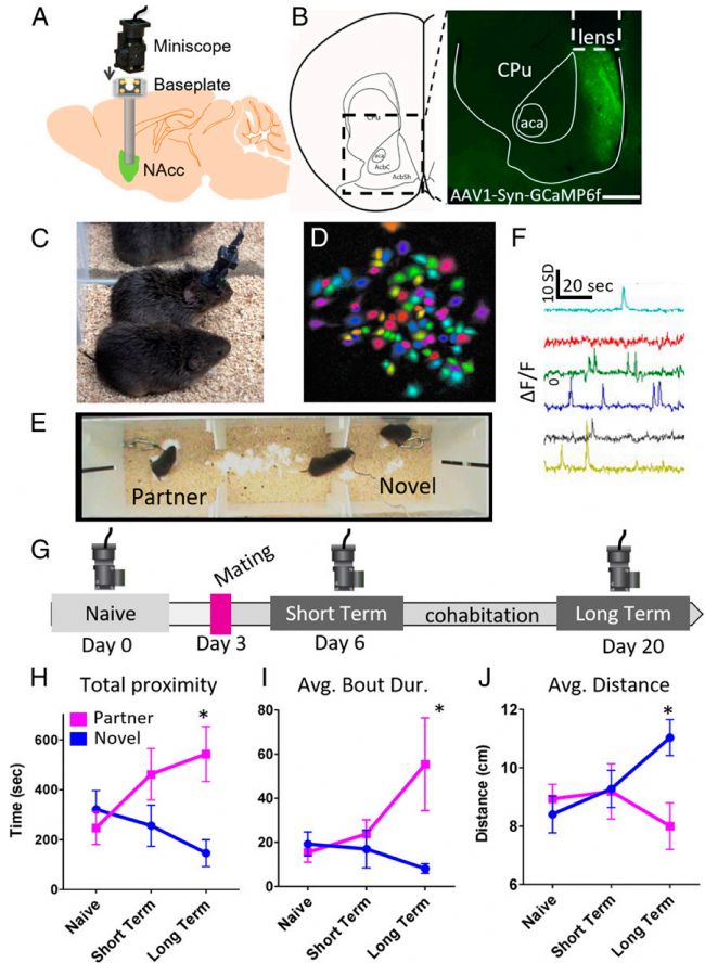 伏隔核在獎勵和動機響應(yīng)中扮演的重要角色使其成為研究人員候選的編碼伴侶-獎勵通路的重點區(qū)域。在人身上,進行功能性MRI的志愿者在認(rèn)為他們正握著伴侶而非陌生人的手時,他們NAc中的血氧信號會增強。在草原田鼠中,毀損這個區(qū)域的神經(jīng)調(diào)節(jié)信號會損傷他們連結(jié)的形成,但接下來的基因表達會使連結(jié)得以維持。此外,在不交配的情況下,激活前額葉到NAc的神經(jīng)通路足以誘導(dǎo)連結(jié)的形成。盡管有大量證據(jù)表明NAc在編碼伴侶連結(jié)中起主要作用,但其背后的神經(jīng)機制以及它隨著關(guān)系進展如何變化仍然未解。因此,研究人員在草原田鼠交配前后,在自由活動狀態(tài)下對NAc的神經(jīng)鈣活動進行了在體成像記錄,以了解大腦在連結(jié)形成、成熟時的活動變化。