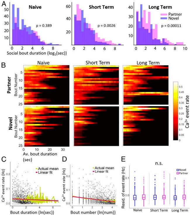 基于人類神經(jīng)成像的研究,研究人員假設(shè)一個已經(jīng)配對的田鼠在和伴侶互動時,NAc神經(jīng)活動會比和陌生人互動要高很多。但在記錄全部的鈣事件后,經(jīng)過對數(shù)據(jù)進行變量控制處理,數(shù)據(jù)結(jié)果并不能倒推與實驗鼠互動的是伴侶鼠還是陌生鼠。他們將實驗中持續(xù)至少1s的互動行為稱作一次社交。幼年期田鼠對兩個陌生鼠的單次社交時長沒有變化;在配對后,實驗鼠和伴侶互動的社交時長明顯比同陌生鼠的長(圖2A)。用其他計量標(biāo)準(zhǔn)衡量實驗鼠與伴侶及陌生鼠的社交時長差異(圖1H–J),也發(fā)現(xiàn)同居、配對時間越久,差異越明顯(圖2A)。