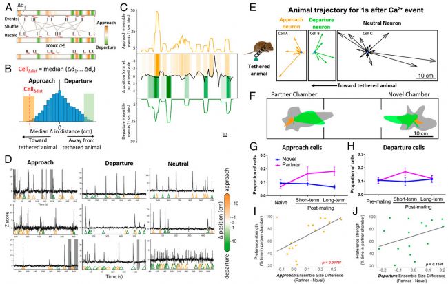 相反,實驗鼠對于伴侶和陌生鼠的“離去”細(xì)胞數(shù)量在任何時間點都沒有差異(圖3H)。同樣,對于伴侶和陌生鼠“離去”細(xì)胞數(shù)量的差異與實驗鼠的伴侶偏好強度也沒有顯著相關(guān)性(圖3J)。