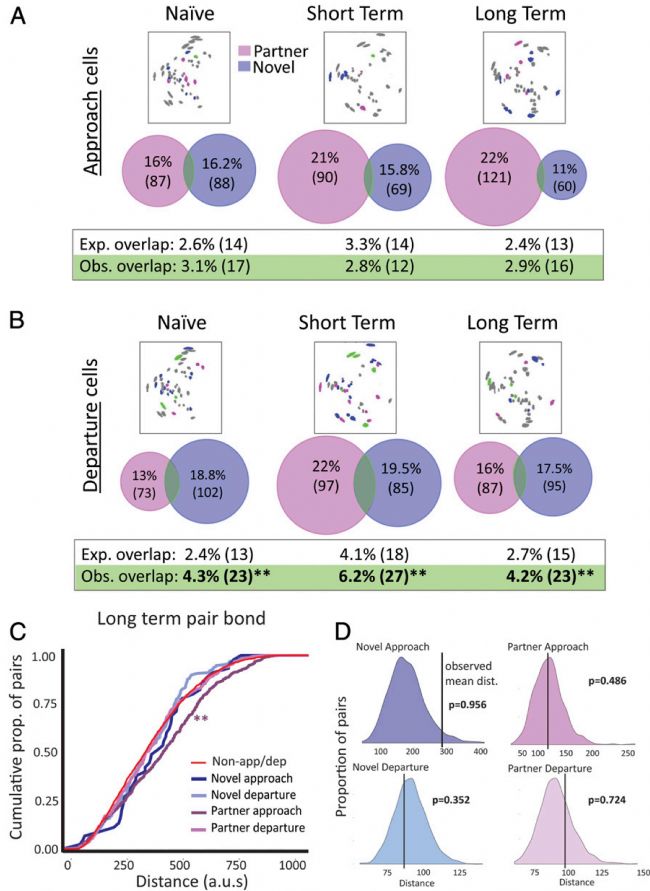 實驗鼠對于伴侶和陌生鼠的靠近細(xì)胞是否屬于不同的群?研究人員進行了排序分析,并對細(xì)胞身份進行了標(biāo)定以計算不同功能亞群之間潛在的分布重疊。通過與空分布進行比較,發(fā)現(xiàn)實驗鼠對伴侶和陌生鼠的“靠近”神經(jīng)元重疊不大于隨機情況(圖4A),表明即使在交配/結(jié)合之前,這些細(xì)胞也可以分屬于各自不同的集合。令人驚訝的是,實驗鼠對伴侶和陌生鼠的“離去”細(xì)胞重疊大于隨機情況(圖4B)。“離去”細(xì)胞群的重疊,表明根據(jù)這種軌跡標(biāo)準(zhǔn)不能準(zhǔn)確的定義區(qū)分“離去”細(xì)胞。