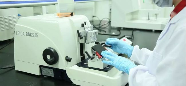 360°旋轉(zhuǎn)右手手輪進行切片,收集平整無刀痕和皺褶的切片進行烤片。