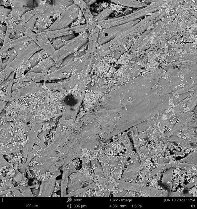 圖 3 是使用飛納臺式掃描電鏡(Phenom XL)拍攝的梧桐樹皮照片,圖 3 (a) 是在高真空模式(HIGH)下拍攝的圖片,樹皮表面放電現(xiàn)象明顯,局部區(qū)域發(fā)亮;采用低真空模式(LOW)拍攝,可以發(fā)現(xiàn)樣品表面放電現(xiàn)象消失。