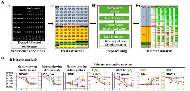 韓國大邱基礎(chǔ)科學研究所Jeongsik Kim、Pyung Ok Lim等,利用PlantScreen大型高通量表型組學研究平臺,對植物葉片衰老進行了系列研究(參見論文:Jae IL Lyu etc. 2017. High-throughput and computational study of leaf senescence through a phenomic approach. Frontiers in Plant Science):