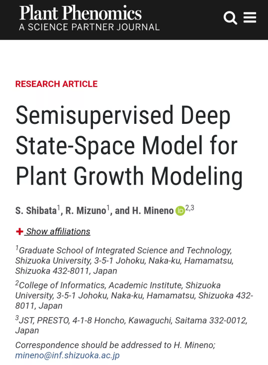 S. Shibata, R. Mizuno, and H. Mineno, “Semisupervised Deep State-Space Model for Plant Growth Modeling,” Plant Phenomics, vol. 2020, Article ID 4261965, 16 pages, 2020.