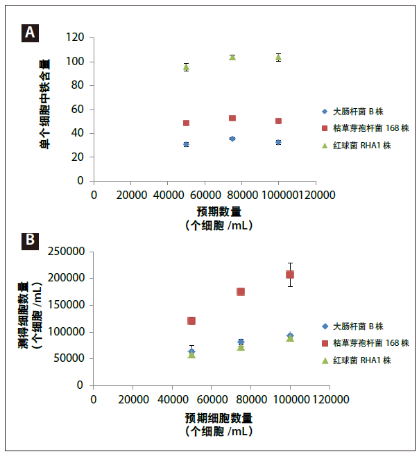 為測試細胞重疊現(xiàn)象,將細菌細胞經(jīng)系列稀釋后進行測定。上圖表明,將細菌細胞稀釋至100,000、75,000和50,000個細胞/mL濃度時,單個細胞的鐵平均含量并沒有發(fā)生變化,反而每次稀釋后,細胞數(shù)量呈線性變化,結(jié)果表明,細胞濃度對細胞重疊無顯著影響。