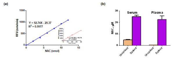 (b)單供體人血漿(5μl,黃色),以及加入5nmol NAC標(biāo)準(zhǔn)品(相當(dāng)于20μM游離NAC,紫色)后進(jìn)行樣本中NAC的檢測(cè);血清和血漿樣本中NAC濃度分別為4.8±0.3μM和0.7±0.0μM,平均加標(biāo)回收率分別為92.0%和93.5%。
