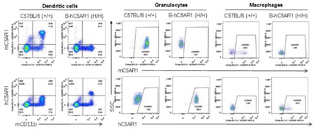 流式分析純合 B-hC5AR1 小鼠C5AR1蛋白表達。收集野生型和純合 B-hC5AR1 (H/H) 小鼠的脾細胞,并用種屬特異性抗 C5AR1 抗體進行流式分析。結(jié)果顯示,B-hC5AR1 小鼠脾臟樹突狀細胞、粒細胞和巨噬細胞中可檢測到人源C5AR1蛋白表達,未檢測到鼠源蛋白表達。在野生型小鼠中僅能檢測到小鼠C5AR1蛋白表達,未檢測到人源蛋白表達。