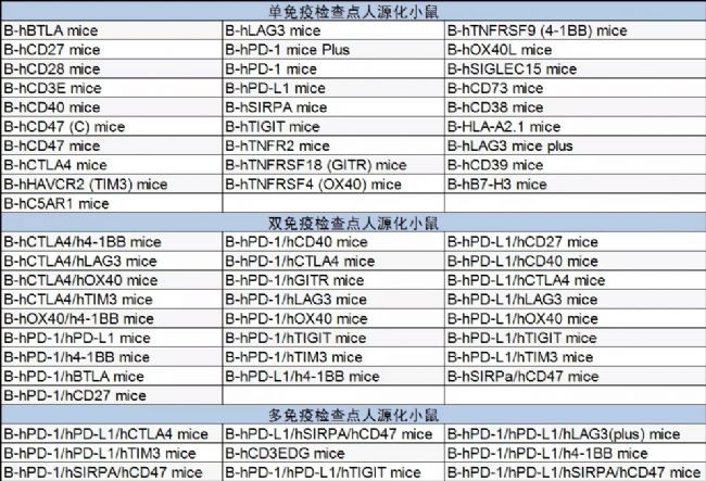 百奧賽圖免疫檢查點人源化小鼠列表