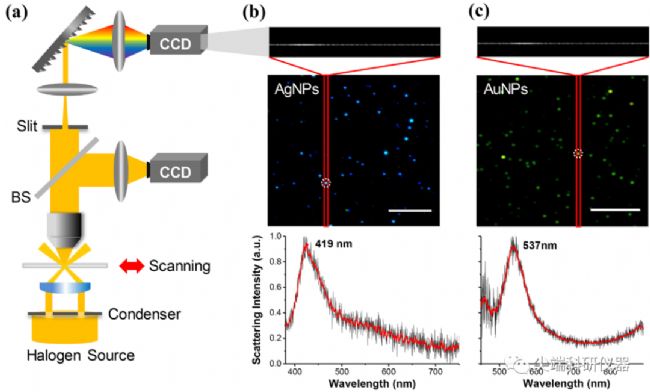 圖2:AuNPs和AgNPs的高光譜暗場成像和光譜表征示意圖