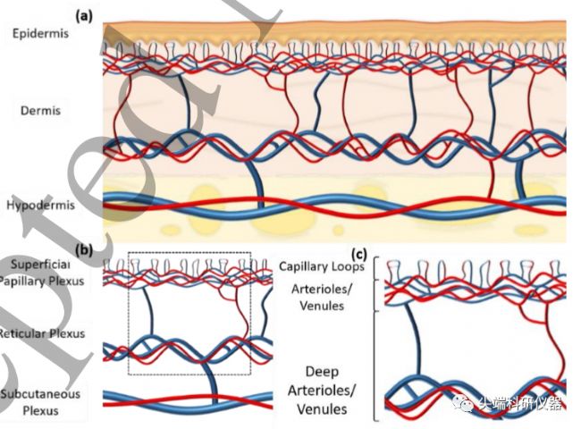 微循環(huán)疾病近年來被廣泛關(guān)注,盡管我們知道微循環(huán)在調(diào)節(jié)生理機能方面和疾病發(fā)生發(fā)展方面有著十分重要的作用,但是目前我們對其仍然知之甚少,而隨著醫(yī)學影像學的突破近年來一些無損微循環(huán)成像技術(shù)走上了科研與臨床的舞臺。今天就讓我們借著一篇研究皮膚微循環(huán)成像技術(shù)的綜述來盤點一下目前科研及臨床領(lǐng)域中的微循環(huán)無損成像技術(shù)吧!我們知道皮膚上微血管構(gòu)成主要在真皮層和皮下組織中(如下圖)。真皮層通常1-4mm厚里面包含血管,淋巴管,毛囊,腺體等組織結(jié)構(gòu)。而皮下組織厚度為5-20mm主要由脂肪組織構(gòu)成。而其真皮層的毛細血管主要為淺表乳頭血管叢、網(wǎng)狀神經(jīng)血管叢,皮下組織中為皮下血管從如下圖。