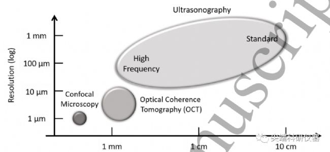 圖二:常用的皮膚血管成像模式,圖標中XY軸分別表示成像分辨率和穿透深度。左一圓點所示為共聚焦顯微鏡,穿透深度>100µm,分辨率為1µm;左二為光學相干層析成像(OCT),穿透深度>1 mm,分辨率為10µm;左三為超聲成像,超聲穿透深度可達10 cm,分辨率超過10µm。