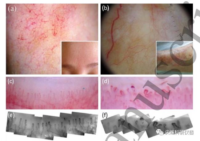圖三:皮膚鏡和毛細血管鏡檢查。(a) 酒渣鼻患者的皮膚鏡成像,顯示呈多邊形網(wǎng)絡排列的線性血管。(b) 皮膚鏡檢查一例晚期脂質(zhì)壞死性病變的患者,顯示細長的、分叉的、集中的蛇形血管。(c) (d)兩種不同倍數(shù)的甲襞微血管的皮膚鏡圖像。(e) 和(f)分別與(c)和(d)相關(guān)的高倍率(300倍)毛細血管鏡圖像。(c) 和(e)取自原發(fā)性雷諾氏現(xiàn)象的患者,顯示正常的發(fā)夾狀毛細血管環(huán);而(d)和(f)取自系統(tǒng)性硬化癥患者,顯示環(huán)變寬、無血管和出血。皮膚鏡是除了肉眼評估外,評估皮膚微血管最經(jīng)濟的方法,皮膚鏡最早用于提高黑色素瘤的檢測,它是利用一種手持式放大鏡,來評估通過光譜反射率,通常在10倍放大鏡下觀察表皮的色素結(jié)構(gòu)。該方式可以對黑色素細胞性皮膚腫瘤與非黑色素細胞性皮膚腫瘤以及良性與惡性無色素皮膚腫瘤進行分類。例如,Zaluadek等人,用皮膚鏡檢查有色素和無色素的鮑恩氏病或鱗狀細胞在重復的血管和結(jié)構(gòu)形態(tài)學發(fā)現(xiàn),皮膚鏡檢查可提高此類疾病的診斷準確性。
