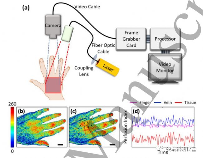圖五:激光散斑對比成像(LSCI)。(a) 顯示LSCI設(shè)置典型布置的示意圖。(b) 中風患者左手背的傳統(tǒng)LSCI。(c) (b)中同一患者的雙波長LSCI,感興趣區(qū)域用黑色箭頭突出顯示。(d) 灌注指數(shù)信號來自于(c)中突出顯示的三個感興趣區(qū)域,手指、靜脈和皮膚組織。色階表示0(低)–260(高)的灌注指數(shù)。比例尺代表15毫米。當相干光從粗糙表面反射或從含有散射物質(zhì)的介質(zhì)內(nèi)部后向散射或透射時,會形成不規(guī)則的強度分布,出現(xiàn)隨機分布的斑點。粗糙表面和介質(zhì)中散射子可以看作是由不規(guī)則分布的大量面元構(gòu)成,相干光照射時,不同的面元對入射相干光的反射或散射會引起不同的光程差,反射或散射的光波動在空間相遇時會發(fā)生干涉現(xiàn)象。當數(shù)目很多的面元不規(guī)則分布時,可以觀察到隨機分布的顆粒狀結(jié)構(gòu)的圖案,這就是光通過散射介質(zhì)和自由空間傳播時形成的散斑(顆粒狀結(jié)構(gòu)斑點稱為散斑)。LSCI已經(jīng)被用于許多臨床前-和臨床研究;例如,作為冠狀動脈疾病患者的微血管功能研究工具和預測小兒燙傷愈合時間的機制研究?紤]到LSCI的簡單性及其相對于其他成像技術(shù)的假定優(yōu)勢,它已經(jīng)與LDF116和LDPI117在皮膚成像能力方面進行了比較。例如,Tew等人比較了LSCI用LDF評價閉塞后反應性充血(PORH)微血管功能并得出結(jié)論,雖然LSCI總體上比LDF更具可復制性,但很可能是由于較低的位點間變異性,LSCI的敏感性增加使得低血流量區(qū)域的成像出現(xiàn)不可重復等問題。