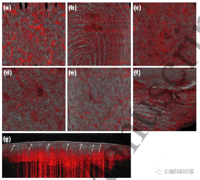 圖六:動態(tài)光學相干斷層掃描(dOCT)健康皮膚血管系統(tǒng),其中正面OCT結(jié)構(gòu)圖像(灰色)覆蓋血管信息(紅色)。(a) 左臉頰的正面圖像。(b) 左手食指指尖的正面圖像。(c) 右腿的正面圖像。(d) 左臂的正面圖像。(e) 后背的正面圖像。(f) 左手食指左側(cè)甲襞的正面圖像。(g) 右腿的橫截面圖像。許多不同的血管形態(tài)被表示出來,例如活體指紋,(b),網(wǎng)狀圖案,(c),逗號和圓點,(d)和(e)。所有正面圖像表示6 x 6 mm的視野和6 x 2 mm的橫截面圖像。DOCT技術(shù)是將OCT技術(shù)進行拓展加入多普勒測量血流及血流方向的一種成像方式,原理上類似超聲多普勒,但是能夠包含更多信息,DOCT將多普勒原理與OCT結(jié)合起來,可達到10µm的空間分辨率,血流識別靈敏度可識別低至10µm/s的血液流速。DOCT用于微血管成像的限制之一是多普勒效應取決于探頭與血流方向之間的角度,這意味著使用此方法收集的數(shù)據(jù)會受到相當大的人員操作影響。