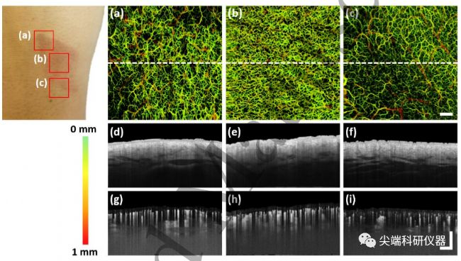圖八:燙傷后24小時的光學相干斷層攝影術(shù)(OCTA)。圖中是一張右手腕背部燙傷的照片。三個紅色方框代表三個感興趣的區(qū)域:(a)–(c)。(a) –(c)燙傷傷口的正面圖。圖示為兩個邊界掃描(a)和(c)以及傷口中心掃描(b)。邊界掃描清晰可見血管密度的變化與傷口的形狀相一致。與傷口周圍皮膚相比,傷口內(nèi)的毛細血管密度顯著增高。(d) –(f)皮膚結(jié)構(gòu)的橫截面圖像,分別與(a)–(c)中的白色穿孔線相關(guān)。(g) –(i)皮膚血管系統(tǒng)的橫截面圖像;同樣,分別與(a)–(c)中的白色穿孔線相關(guān)。血管密度在這里,再次出現(xiàn)在傷口內(nèi)最密集。色條代表用顏色編碼的血管深度。比例尺代表1毫米。