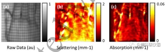 圖十:個人右手的SFDI成像。(a) SFDI采集的原始數(shù)據(jù)具有圖案結(jié)構(gòu)照明可見。(b) 由(A)導出的簡化散射圖。(c) 由(A)導出的剖面校正吸收圖。空間頻域成像(SFDI)是另一種新型的成像方式,可用來評價皮膚血流灌注。SFDI具有寬視野、無創(chuàng)成像的特性,利用皮膚的光學特性和生化成分來產(chǎn)生結(jié)構(gòu)特征和生色團(如血紅蛋白)濃度的組織圖。最初由Cuccia等人提出并應用。在廣泛應用于皮膚研究之前,它通常測量空間調(diào)制光的漫反射系數(shù),此技術(shù)的原理是通過量化組織(即在此情況下的皮膚)減少的散射系數(shù)和光學吸收(µs和µα),同時成像皮膚的表面結(jié)構(gòu)特征,并通過評估氧合血紅蛋白含量來間接監(jiān)測皮膚的血管健康狀況。但由于其特性要求被測試者處于靜止不動狀態(tài)要求較高,和成像速度不足,導致其目前也仍處于不成熟的狀態(tài)。