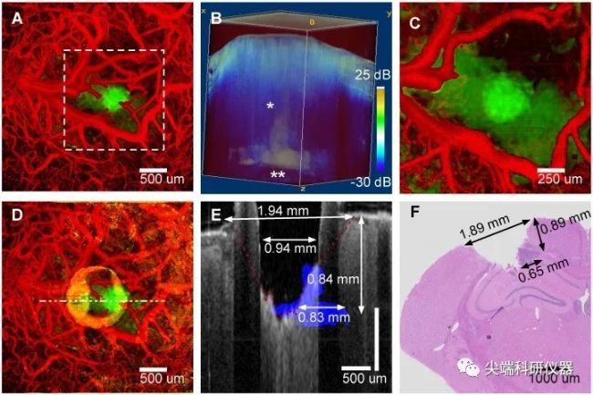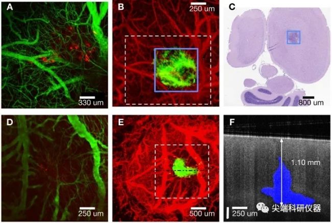 A)小鼠#1的共聚焦熒光顯微鏡Z投影(皮質(zhì)表面-250 µm)。可見表達(dá)RFP(紅色)和血管系統(tǒng)(綠色)的癌細(xì)胞。B)小鼠#1OCT血管造影(紅色),衰減系數(shù)小于5.7的5.7 mm -1(綠色)Z投影(皮質(zhì)表面-2 mm)。C)距皮層表面550 µm的橫截面為5 µm厚的組織學(xué)。D)共聚焦熒光顯微鏡觀察小鼠#2的Z投影(皮質(zhì)表面-250 µm)。E)小鼠#2的OCT血管造影(紅色),衰減系數(shù)小于5.7 mm -1(綠色)Z投影(皮質(zhì)表面-2 mm)。F)具有腫瘤區(qū)域(藍(lán)色)的B掃描(圖E中的水平線)表明衰減系數(shù)小于5.7mm -1。