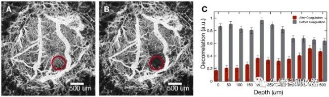 A)凝結(jié)前(2號小鼠)OCT血管造影數(shù)據(jù)的最大強(qiáng)度投影。B)凝結(jié)后(2號小鼠)OCT血管造影數(shù)據(jù)的最大強(qiáng)度投影。C)凝結(jié)前(灰色)和凝結(jié)后(紅色)的突出區(qū)域的去相關(guān)值。