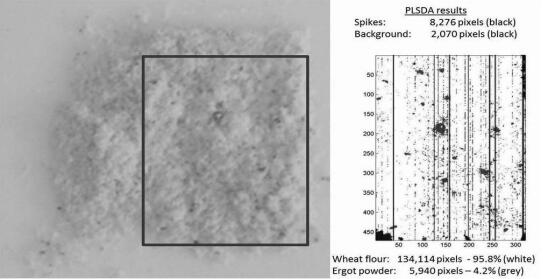 上左圖為混有5%麥角菌粉末的面粉樣本真彩色圖,右圖為高光譜圖像處理后的分類結果,其中白色的部分為面粉,灰色為麥角菌1。