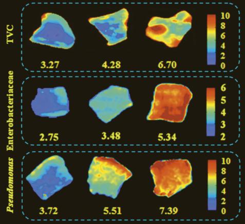 上圖為在4oC低溫保存不同時長的雞肉切片上大腸桿菌和假單胞菌菌株的分布情況,假彩色可表征細菌濃度?衫么藬(shù)據(jù)結果及時決策:拋棄或者及時采取措施進行補救處理。
