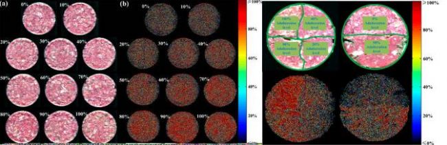 上圖(a)為在優(yōu)質(zhì)豬肉糜中摻入不同濃度豬頸肉的樣本假彩色圖,(b)為基于高光譜成像技術的分類結果示意圖2
