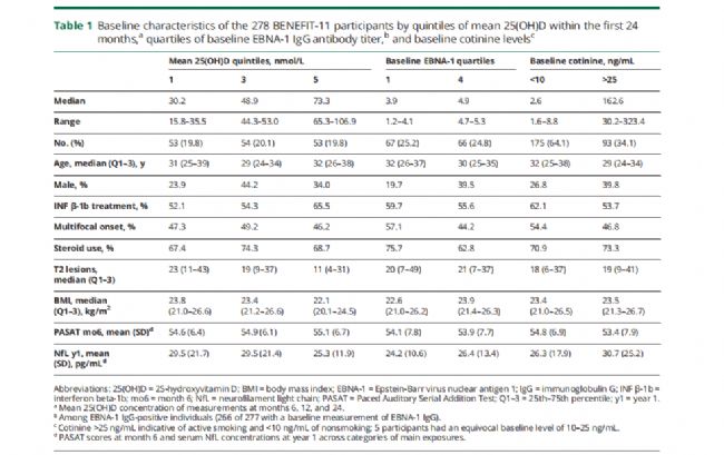 在本研究中,研究人員將隨訪時(shí)間延長(zhǎng)至11年,并在復(fù)發(fā)緩解性MS首次復(fù)發(fā)早期探討維生素D、吸煙和抗EBNA -1抗體是否有助于預(yù)測(cè)獨(dú)立于疾病治療的長(zhǎng)期認(rèn)知功能和神經(jīng)軸突完整性。本研究采用盲法隨訪5年,隨后觀察至8.7年,然后在第11年進(jìn)行評(píng)估,以評(píng)估早期治療的長(zhǎng)期效果。