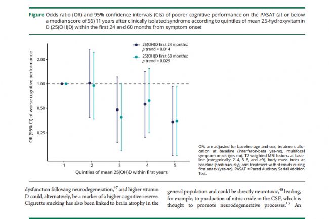 Figure. 根據(jù)癥狀出現(xiàn)后24個(gè)月和60個(gè)月內(nèi)平均25(OH)D五分位數(shù),臨床分離綜合征11年后PASAT(中位得分56分或以下)認(rèn)知能力較差的比值比(OR)和95%置信區(qū)間(CIs)
