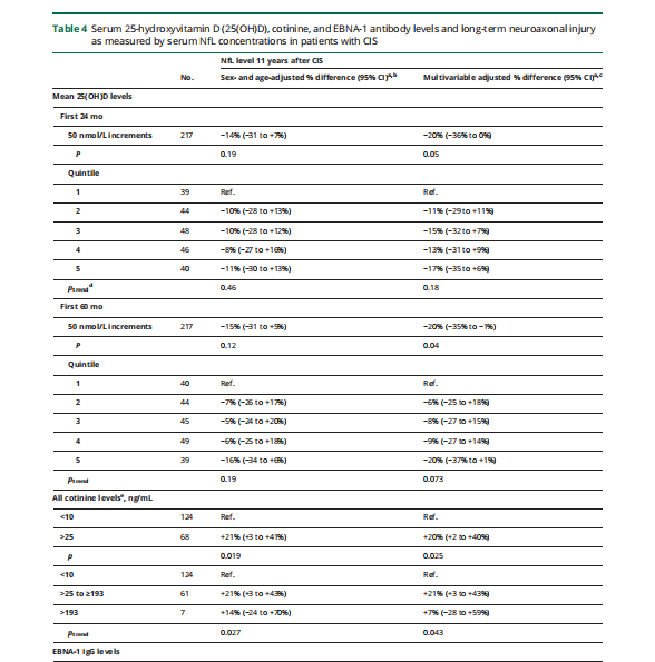 表4:CIS患者血清NfL濃度測(cè)定血清25-羥基維生素D (25(OH)D)、可替寧和EBNA-1抗體水平和長(zhǎng)期神經(jīng)軸突損傷