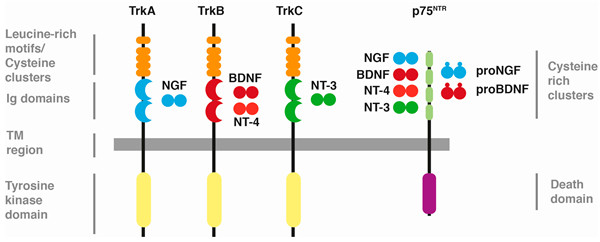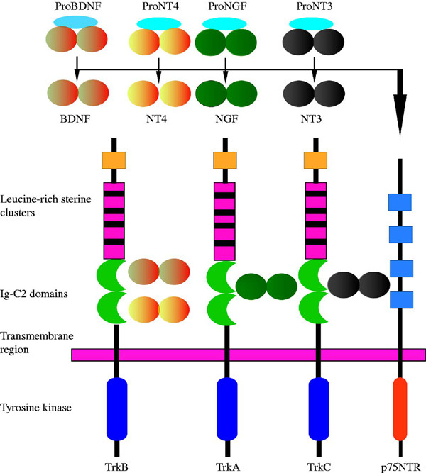 神經(jīng)營(yíng)養(yǎng)因子受體是一組與神經(jīng)營(yíng)養(yǎng)因子特異性結(jié)合的生長(zhǎng)因子受體。已發(fā)現(xiàn)的與神經(jīng)營(yíng)養(yǎng)因子對(duì)應(yīng)的受體有酪氨酸激酶受體的“ Trk”家族和p75NTR。p75NTR是一種低親和力的神經(jīng)營(yíng)養(yǎng)因子受體,所有神經(jīng)營(yíng)養(yǎng)因子都與之結(jié)合。它是腫瘤壞死超家族的成員。Trk家族包括TrkA,TrkB和TrkC,并且只與特定的神經(jīng)營(yíng)養(yǎng)因子結(jié)合,但有更高的親和力。Trks介導(dǎo)神經(jīng)營(yíng)養(yǎng)因子的功能信號(hào)。