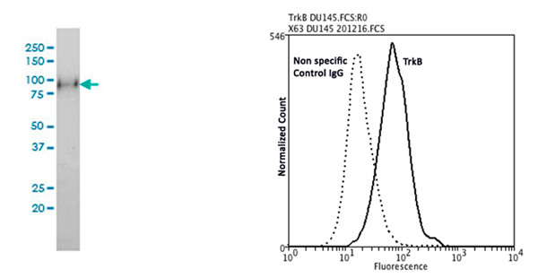 左圖:Western blot檢測(cè)人源性肉瘤細(xì)胞裂解物中酪氨酸激酶受體B型(TrkB)的表達(dá)。右圖:通過(guò)流式細(xì)胞術(shù)分析人前列腺癌DU145細(xì)胞系中TrkB表達(dá)。DU145細(xì)胞用PBS洗滌兩次,封閉:200 ug / mL正常綿羊IgG(20分鐘),一抗:小鼠抗TrkB的單抗(貨號(hào)M-853-100,每~ 106細(xì)胞約2μg)在冰上,二抗:山羊抗小鼠PE標(biāo)記的二抗(1:100倍稀釋?zhuān),在室溫下于黑暗中孵?0分鐘。非特異性對(duì)照IgG,克隆X63(貨號(hào)M-1249-100)在相同條件下(黑色虛線)用作陰性對(duì)照。流式細(xì)胞儀數(shù)據(jù)和結(jié)果是使用Orflo MoxiflowTM儀器和protocol生成的。