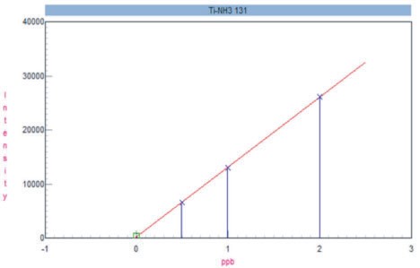 由于鈦同位素存在諸多潛在干擾,因此分析過(guò)程中使用氨作為反應(yīng)氣體,將鈦轉(zhuǎn)換為T(mén)i-NH3 簇/[TiNH(NH3)4](m/z 131)。
