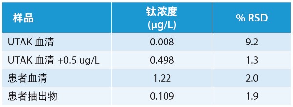 對(duì)三個(gè)樣品進(jìn)行了分析。它們(稀釋20 倍)的結(jié)果參見(jiàn)下表。對(duì)UTAK 血清中進(jìn)行鈦加標(biāo)0.5 μg/L,回收率為98%,證明此方法是準(zhǔn)確的;颊邩悠分械拟伜扛撸貏e是在血清中。