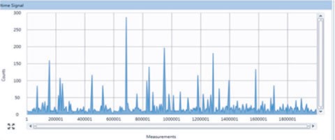 使用NIST認(rèn)證的1898 TiO2 納米微粒,我們對(duì)0.2% HNO3 中的1 μg/L TiO2 納米顆粒懸浮液進(jìn)行分析。下圖顯示實(shí)時(shí)信號(hào)與時(shí)間曲線圖、粒徑與頻率柱狀圖,說(shuō)明最大概率粒徑為80 nm,與NIST 認(rèn)證中所示的71-83 nm 非常接近。