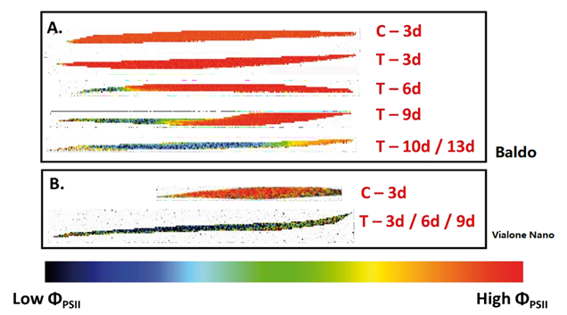 研究中還發(fā)現(xiàn),在耐鹽品種Baldo鹽脅迫組的第2葉、第3葉的NPQ(非光化學熒光淬滅)顯著高于對照,且ΦPSⅡ保持在較高狀態(tài)的葉片區(qū)域其NPQ越高,而在Vialone Nano中則未出現(xiàn)這種趨勢。說明NPQ的升高與水稻應對脅迫的能力有關。