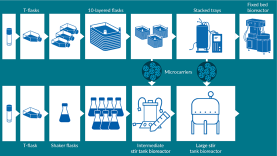 線性擴(kuò)展(Scale out):多次進(jìn)行相同定義的單元操作。這是一個(gè)好主意,因?yàn)樗且阎膯卧僮鞴ぷ。以貼壁細(xì)胞擴(kuò)增為例,可以從T型瓶開(kāi)始,然后進(jìn)入一個(gè)稍大的容器,比如分層T型瓶。同樣的概念也適用于懸浮細(xì)胞,從最初的搖瓶或轉(zhuǎn)瓶,擴(kuò)大到多個(gè)轉(zhuǎn)瓶。然而,這種方法有一定的局限性,主要瓶頸是所需的空間和操作數(shù)量,潔凈室空間與培養(yǎng)箱數(shù)量有限,所需的勞動(dòng)量也是進(jìn)一步的限制因素。因此,上述方法只適用于中小型生產(chǎn)。
