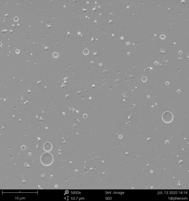 由于玻璃瓶表面相對(duì)平整,沒(méi)有明顯襯度,飛納電鏡高亮度的 CeB6 燈絲在尋找侵蝕和脫片過(guò)程中具有更明顯的優(yōu)勢(shì)。同時(shí),侵蝕的厚度往往只有幾十納米左右,需要利用低電壓進(jìn)行成像以降低穿透深度,飛納電鏡低電壓性能更為優(yōu)異,成像優(yōu)勢(shì)更為明顯。