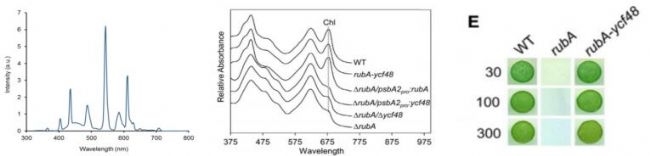 研究者使用熒光燈對(duì)樣品進(jìn)行培養(yǎng),并模擬光暗周期變化以激活光合功能。熒光燈光譜使用SpectraPen SP110手持式光譜儀進(jìn)行測(cè)量,以確保其符合實(shí)驗(yàn)要求。之后對(duì)樣品吸收光譜進(jìn)行的測(cè)量,展現(xiàn)了不同突變株對(duì)各個(gè)波段光的吸收率變化。其中679nm的吸收率可以反映葉綠素濃度的變化(圖1)。