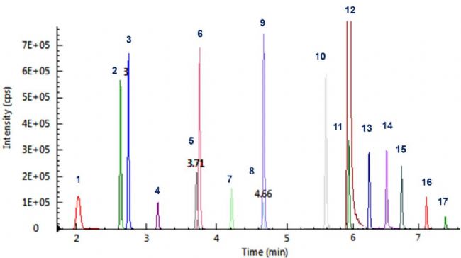 飲用水中17種PFAS化合物的提取離子流色譜圖
