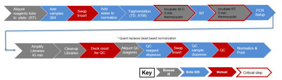 圖2. 微量化Illumina Nextera XT文庫制備的自動化流程。灰色代表Biomek i5完成步驟,藍色代表Echo 525完成步驟,紅色代表手工干預(yù)步驟。Echo用于反應(yīng)體系構(gòu)建及Normalization/pooling;Biomek配置384通道加樣器,并具有選擇性吸頭移液功能,用于分裝Echo所需試劑并進行產(chǎn)物純化;可選配臺面整合的PCR儀,用于PCR擴增和孵育,減少人為干預(yù)。