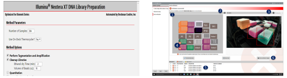 圖3.向?qū)降能浖僮鹘缑妫ㄗ螅,和臺面自動校對功能 (右)。如左圖所示,在軟件操作界面上用戶可以選擇樣本數(shù)量,是否使用臺面整合的PCR儀,以及運行工作流程的哪個部分。具備臺面自動校對功能(右圖),當(dāng)操作人員完成耗材擺放后,工作站可自動判定耗材擺放是否正確,對錯誤擺放位置進行提示,確保程序運行前臺面擺放正確。避免由于人為擺放耗材錯誤,導(dǎo)致設(shè)備碰撞或試劑、時間損失。