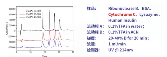 選擇色譜粒徑大小要綜合考慮分離效率和成本。下圖是用納微科技UniPS系列不同粒徑聚合物色譜填料(粒徑分別為10、20、30微米)對(duì)多肽、蛋白等分離效果的影響。