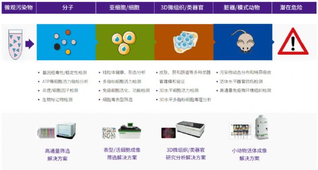 雖然對(duì)于微觀污染物的生物危害性研究占到了微觀污染物研究的一半左右,但總體而言,微觀污染物的生物毒性和健康風(fēng)險(xiǎn)尚不明確。理論上講,只要微塑料的尺寸足夠小,無(wú)論其本體還是其吸附的有害物質(zhì),都可能會(huì)通過(guò)某種途徑進(jìn)入到生物體的器官、組織甚至細(xì)胞當(dāng)中,對(duì)健康造成威脅。針對(duì)環(huán)境微觀污染物相關(guān)的毒性研究,珀金埃爾默生命科學(xué)產(chǎn)品線結(jié)合表型篩選、免疫毒性和類器官模型等前沿毒理研究應(yīng)用,提供涵蓋分子-細(xì)胞-3D類器官-活體動(dòng)物的全面解決方案。