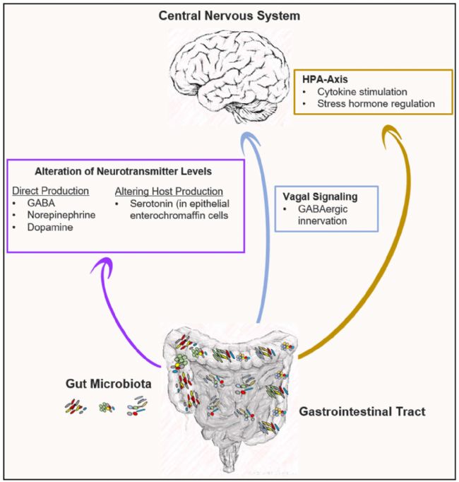 微生物-腸-腦軸是將大腦和腸道功能整合的雙向信息交流系統(tǒng),并涉及神經(jīng)、免疫和內(nèi)分泌機(jī)制。除了神經(jīng)內(nèi)分泌系統(tǒng)和神經(jīng)免疫系統(tǒng)之外,該軸還包括了中樞神經(jīng)系統(tǒng)(CNS)、自主神經(jīng)系統(tǒng)(ANS)的交感神經(jīng)和副交感神經(jīng)分支以及腸道神經(jīng)系統(tǒng)(ENS)。從腸道到CNS的傳入纖維(如大腦、扣帶回、小腦扁桃體和扁桃體皮質(zhì))以及腸道平滑肌的效應(yīng)纖維是沿著微生物-腸-腦軸進(jìn)行雙向信息交流的主要途徑。