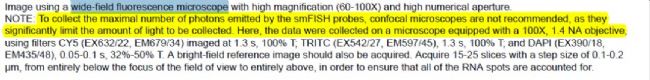 smFISH的實(shí)驗(yàn)過程中探針會(huì)發(fā)出大量光子,而共聚焦則會(huì)顯著限制光子收集的數(shù)量,為了最大限度回收這些光子,更建議使用寬場(chǎng)技術(shù)。