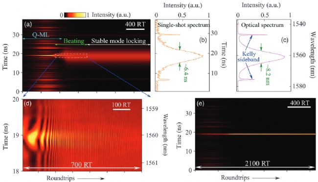過去20多年里,對于被動鎖模的建立機(jī)制,有許許多多的理論和實驗上的探索。在出現(xiàn)時間拉升技術(shù)之前,瞬態(tài)現(xiàn)象只能通過示波器來觀察,但是示波器無法解析出瞬態(tài)的建立過程。進(jìn)來隨著時間拉伸技術(shù)的出現(xiàn),瞬態(tài)光譜和時域動態(tài)都可以被觀察到了。